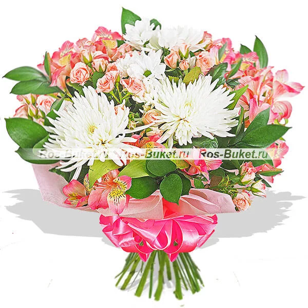 Стандартный (на фото): хризантема одноголовая белая - 3 шт, роза кустовая розовая - 4 шт, альстромерия розовая - 4 шт, рускус, фетр розовый, бант розовый.